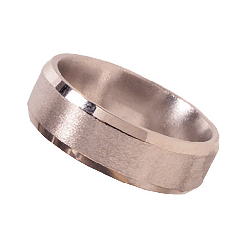 Ti™ titanium wedding band with stone finish. Beveled edges. Ring width: 8mm. Hypoallergenic, comfort fit styling. Limited lifetime guarantee: All Ti™ jewelry is guaranteed for life. If a piece should EVER fail structually, it will be replaced at no charge.