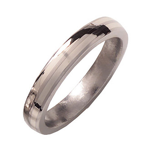 Ti™ polished titanium wedding band. Domed center. Two 1mm 14kt white gold inlays. Ring width: 4mm. Hypoallergenic, comfort fit styling. Limited lifetime guarantee: all Ti™ jewelry is guaranteed for life. If a piece should EVER fail structually, it will be replaced at no charge.