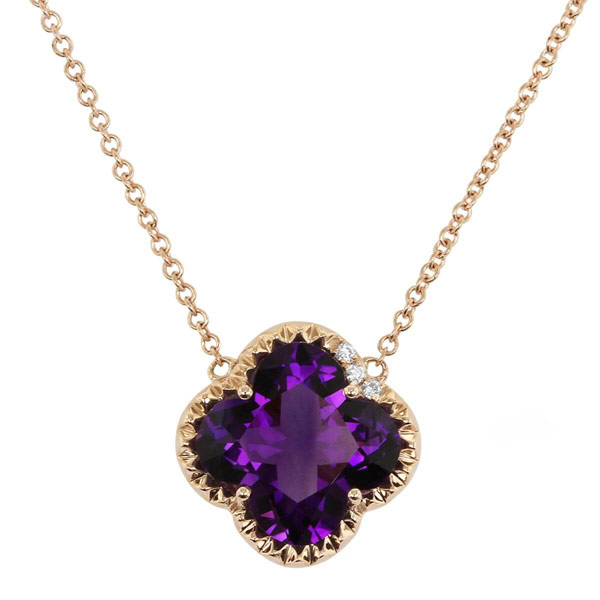 Solid 14k rose gold 3.9 carat amethyst clover necklace has diamond accents. One flower cut amethyst gemstone, AAA quality. Three genuine round diamonds, .02 carat total weight, G color, VS clarity. Pyramid texture. Made in USA.
