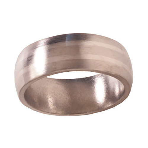 Ti™ titanium wedding band. Satin finish. Domed center with two 1mm platinum inlays. Ring width: 8mm. Hypoallergenic, comfort fit styling. Limited lifetime guarantee: All Ti™ jewelry is guaranteed for life. If a piece should EVER fail structually, it will be replaced at no charge.