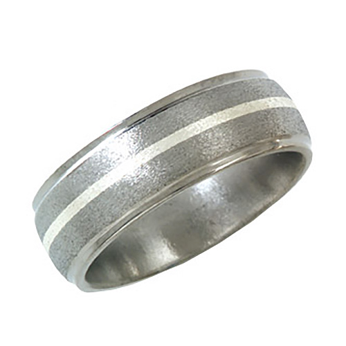 Ti™ titanium wedding band has a 1mm sterling silver inlay. Stone finish. Domed center, grooved edges. Ring width: 8mm. Hypoallergenic, comfort fit styling. Limited lifetime guarantee: All Ti™ jewelry is guaranteed for life. If a piece should EVER fail structually, it will be replaced at no charge.