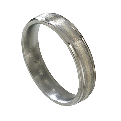 Ti™ titanium wedding band. Stone finish. Flat center, grooved edges. 1mm 14kt white gold inlay. Ring width: 5mm. Hypoallergenic, comfort fit styling. Limited lifetime guarantee: This ring is guaranteed for life. If a piece should EVER fail structually, it will be replaced at no charge.