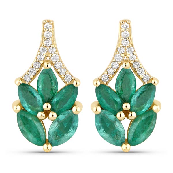 Crafted from solid 14k yellow gold, these earrings feature a central arrangement of five marquise-cut genuine Zambian emeralds, displaying a rich, vibrant green hue. These emeralds are meticulously arranged in a floral or leaf-like pattern. Surrounding the emeralds, small, round diamonds are micro prong-set along the upper curve of the earrings, adding a touch of sparkle and enhancing the overall brilliance. The warm tone of the yellow gold complements the cool green of the emeralds and the dazzling white of the diamonds. Each earring is a mirror image of the other, showcasing symmetry and balance. Four 5mm x 2.5mm marquise-cut emeralds, six 4mm x 2mm marquise-cut emeralds, .91 carat total weight, B quality. 26 genuine round full-cut diamond accents, .08 carat total weight, I1 clarity, H-I color. Posts with push on / pull off backs. Earring size: 14.7mm x 7.8mm. Approximate weight: 2.0 grams. Made in India. Ships from USA.