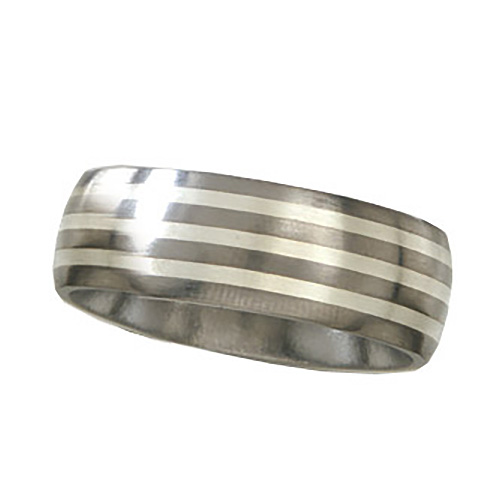 Ti™ titanium wedding band. Satin finish. Domed center. Three 1mm sterling silver inlays. Ring width: 8mm. Hypoallergenic, comfort fit styling. Limited lifetime guarantee: All Ti™ jewelry is guaranteed for life. If a piece should EVER fail structually, it will be replaced at no charge.