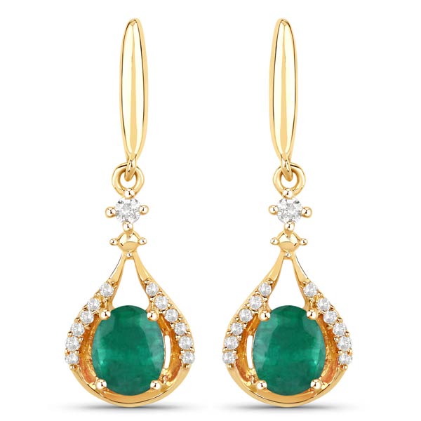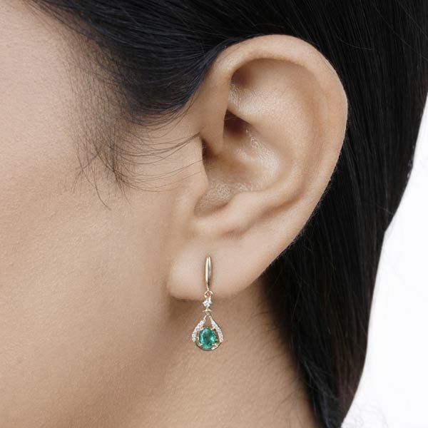 Crafted from solid 14k yellow gold, these earrings feature vibrant, oval-cut Zambian emeralds at their centers, displaying a rich, deep green hue. Each emerald is surrounded on the left and right by delicate ribbons of small round diamonds, adding a sparkling contrast and enhancing the overall brilliance. Above the emeralds, a slender design element incorporates two more small diamonds, also set in white gold, leading to a thin, elongated bar that connects to the ear post. Two 5mm x 4mm oval-cut emeralds, .70 carat total weight, B quality. 24 genuine round full-cut diamond accents, .10 carat total weight, I1 clarity, H-I color. Posts with push on / pull off backs. Earring size: 22.3mm x 7.1mm. Approximate weight: 2.0 grams. Made in India. Ships from USA.