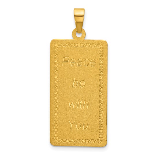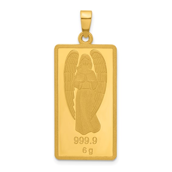 Solid 24k yellow gold bar pendant has an angel design. Pendant size is 17mm x 35mm. Fits up to a 3.5mm wide chain. Approximate weight: 6.0 grams. Made in China. Ships from USA.