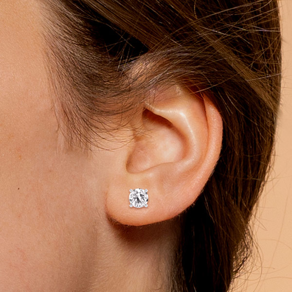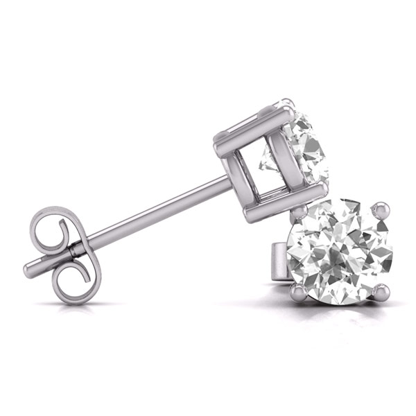 These classic 1 carat total weight lab grown diamond stud earrings are made of solid 14k white gold. Two perfectly matched round lab grown diamonds, 5.0mm round, color E-F, clarity VS1-VS2. Four-prong basket setting maximizes the sparkle. Push on / pull off backs. Approximate item weight: 0.7 grams. Ships from USA.