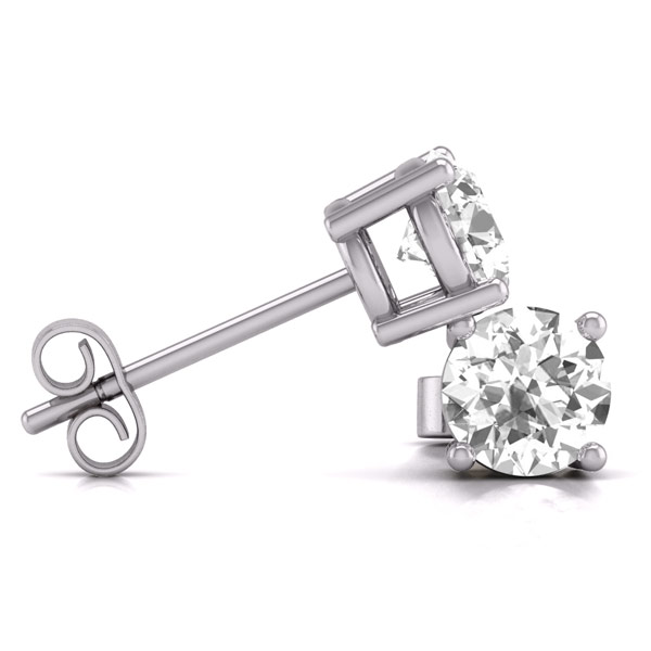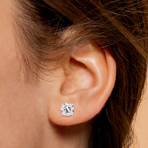 These classic 2 carat total weight lab grown diamond stud earrings are made of solid 14k white gold. Two perfectly matched round lab grown diamonds, 6.5mm round, color E-F, clarity VS1-VS2. Four-prong basket setting maximizes the sparkle. Push on / pull off backs. Approximate item weight: 1.0 gram. Ships from USA.