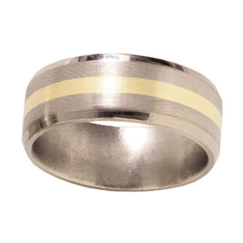 Titanium satin titanium wedding band. 2mm 14kt yellow gold inlay. Beveled edges. Ring width: 8mm. Hypoallergenic, comfort fit styling. Limited lifetime guarantee: this ring is guaranteed for life. If a piece should EVER fail structually, it will be replaced at no charge.