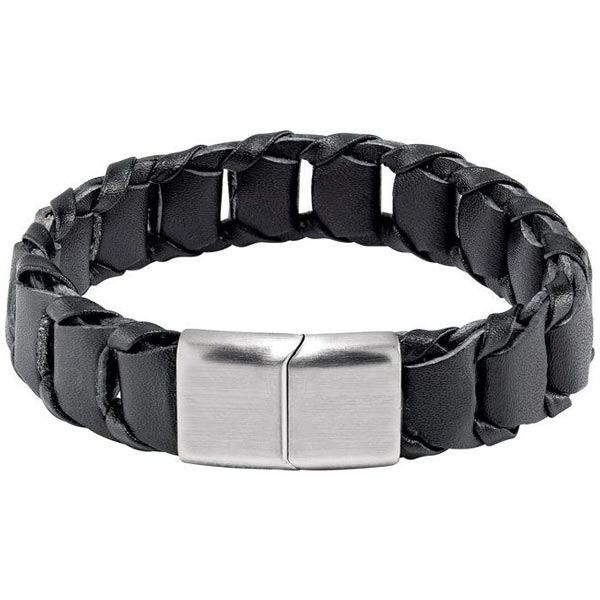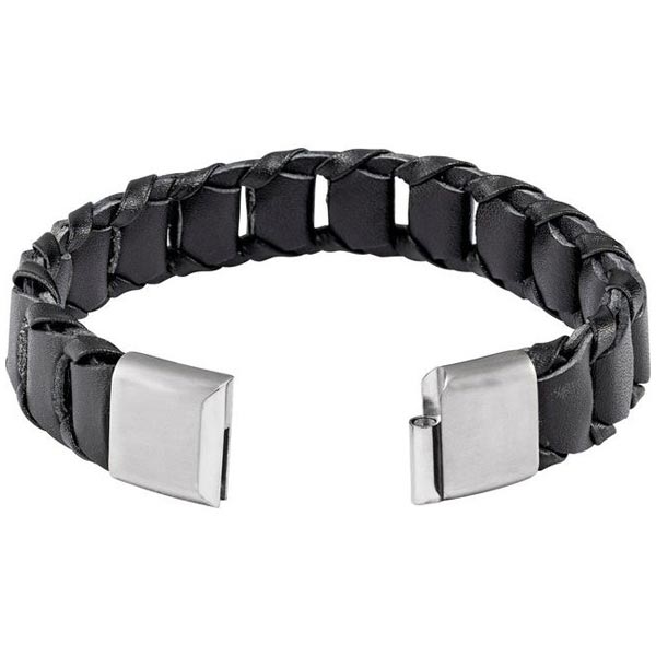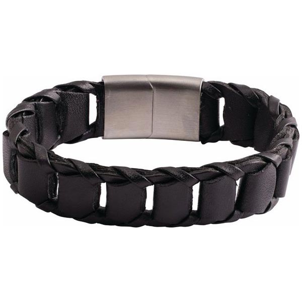 Men's black leather cord bracelet has a brushed stainless steel clasp. Bracelet length: 8.5 inches. Bracelet width: 17mm. Ships from USA.