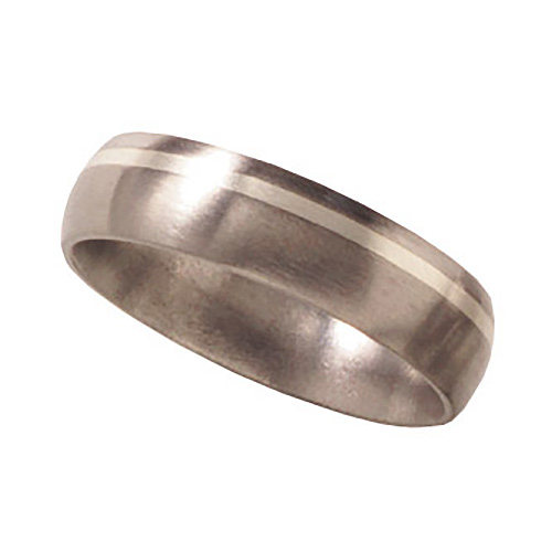 Ti™ titanium wedding band with sterling silver inlay off center. Domed. Satin finish. 1mm sterling silver inlay. Ring width: 6mm. Hypoallergenic, comfort fit styling. Limited lifetime guarantee: All Ti™ jewelry is guaranteed for life. If a piece should EVER fail structually, it will be replaced at no charge.