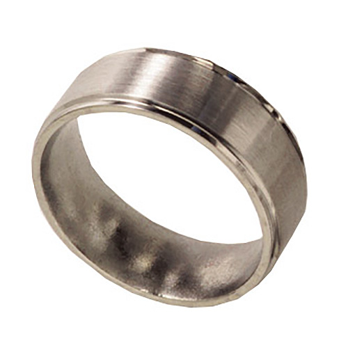Ti™ titanium wedding band. Satin finish. Flat center, grooved edges. Ring width: 8mm. Hypoallergenic, comfort fit styling. Limited lifetime guarantee: All Ti™ jewelry is guaranteed for life. If a piece should EVER fail structually, it will be replaced at no charge.