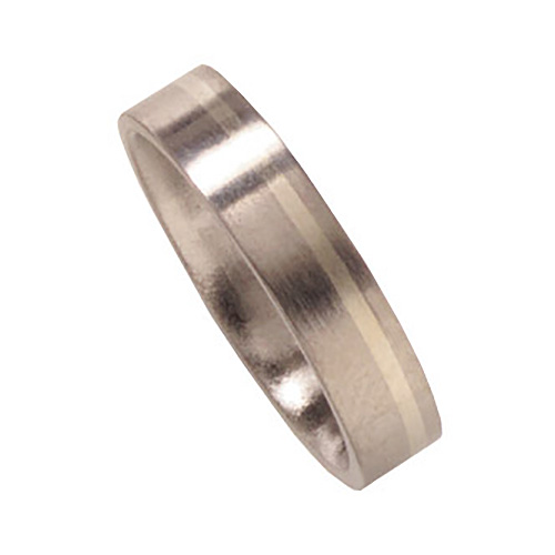 Ti™ titanium wedding band with inlay off center. Flat center. Satin finish. 1mm 14kt white gold inlay. Ring width: 6mm. Hypoallergenic, comfort fit styling. Limited lifetime guarantee: All Ti™ jewelry is guaranteed for life. If a piece should EVER fail structually, it will be replaced at no charge.