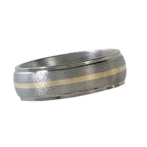 Ti™ titanium wedding band. Stone finish. Domed center, grooved edges. 1mm 14kt yellow gold inlay. Ring width: 7mm. Hypoallergenic, comfort fit styling. Limited lifetime guarantee: All Ti™ jewelry is guaranteed for life. If a piece should EVER fail structually, it will be replaced at no charge.