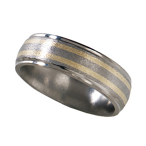 Ti™ titanium wedding band. Stone finish. Domed center, grooved edges. Two 1mm 14kt yellow gold inlays. Ring width: 8mm. Hypoallergenic, comfort fit styling. Limited lifetime guarantee: All Ti™ jewelry is guaranteed for life. If a piece should EVER fail structually, it will be replaced at no charge.