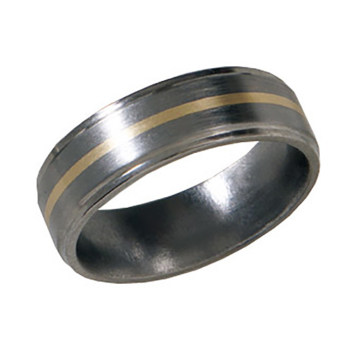 Ti™ titanium wedding band. Stone finish. Flat center, grooved edges. 1mm 14kt yellow gold inlay. Ring width: 7mm. Hypoallergenic, comfort fit styling. Limited lifetime guarantee: All Ti™ jewelry is guaranteed for life. If a piece should EVER fail structually, it will be replaced at no charge.