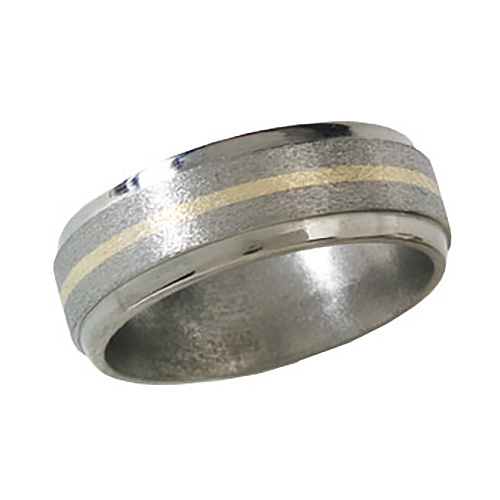 Ti™ titanium wedding band. Stone finish. Beveled edges, 1mm 14kt yellow gold inlay. Ring width: 8mm. Hypoallergenic, comfort fit styling. Limited lifetime guarantee: All Ti™ jewelry is guaranteed for life. If a piece should EVER fail structually, it will be replaced at no charge.