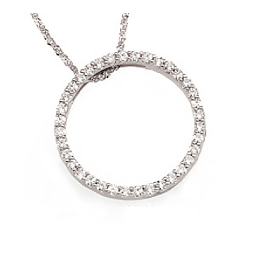 A timeless moissanite masterpiece! This 1 carat total weight circle pendant features 36 2.0mm round Forever Classic moissanite gemstones. Polished 14kt white gold pendant includes 18-inch sparkling Singapore chain.