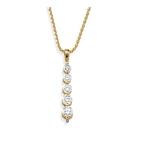 Show your sweetheart your love with this 14k yellow gold five-stone diamond pendant. Diamonds grow in size from top to bottom. Diamond details: 1 x .10CT, 1 x .12CT, 1 x .20CT, 1 x .25CT, 1 x .33CT round facted full cut diamonds; color G-I, clarity I1.