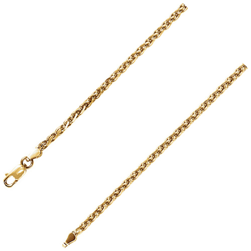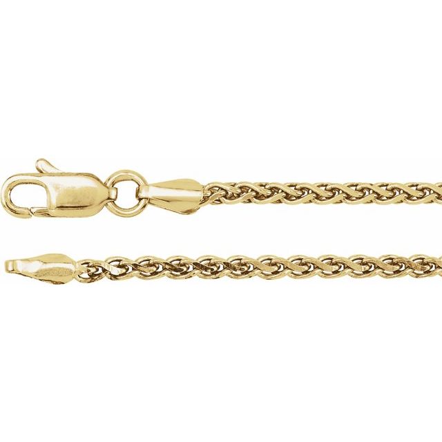 Diamond-cut solid 14k yellow gold wheat chain has a lobster clasp. Width: 2mm. Length: 18 inches. Weighs 9.40 grams. Please note: weight is approximate, actual weight may vary. Made in USA.