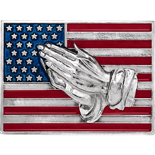 American flag praying hands lapel pin is made of polished 14kt white gold. Item size: 18.50mm x 25.25mm. Weighs 4.82 grams. Please note: weight is approximate, actual weight may vary.