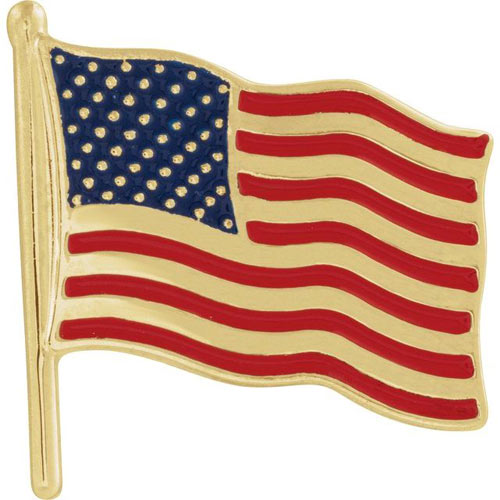 Enameled red and blue American flag lapel pin is made of polished 14kt yellow gold. Dimensions: 17.5mm x 17mm. Weighs 2.77 grams. Please note: weight is approximate, actual weight may vary.