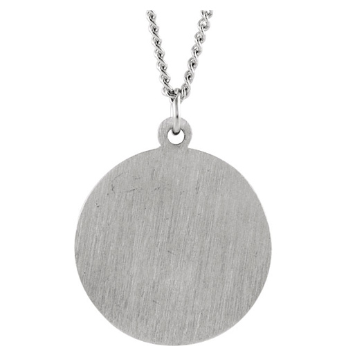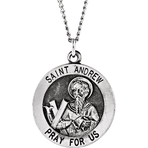 This sterling silver round St Andrew medal dangles from a 18in sterling silver chain. 18.5mm diameter. Inscription: SAINT ANDREW PRAY FOR US. Saint Andrew is the patron saint of elderly maids, fishermen, Greece, Russia and Scotland. Weighs 2.36 grams. Please note: weight is approximate, actual weight may vary. Made in the USA.