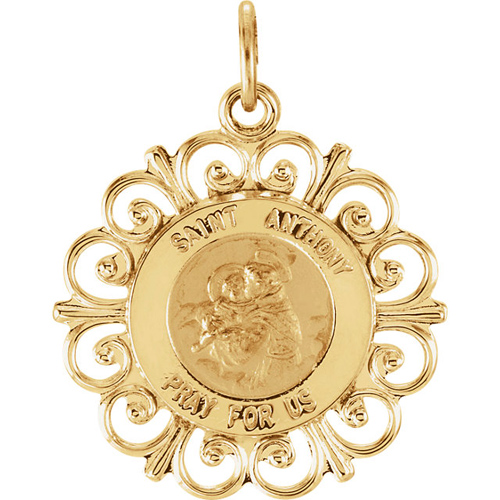 Polished 14kt yellow gold. Medal contains the inscription SAINT ANTHONY PRAY FOR US. Dimensions: 18.5mm diameter. This item is the size of a penny and weighs 1.42 grams. Please note: weight is approximate, actual weight may vary. Chain not included.