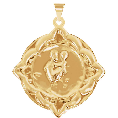 Saint Anthony of Padua sheild medal is made of solid 14k yellow gold. Open back. The entire medal is polished. Center of medal is not brushed. This item is larger than a quarter, dimensions: 31x31mm. Fits up to a 3mm wide chain. Weighs approximately 4.16 grams. Made in USA.