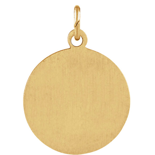 This round St. Barbara medal is made of polished 14kt yellow gold. Dimensions: 18mm diameter. Inscription: SAINT BARBARA PRAY FOR US. Weighs 2.22 grams. Please note: weight is approximate, actual weight may vary. Bail dimensions: 2.5mm x 2.5mm. Made in USA.