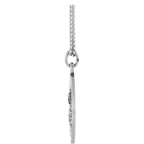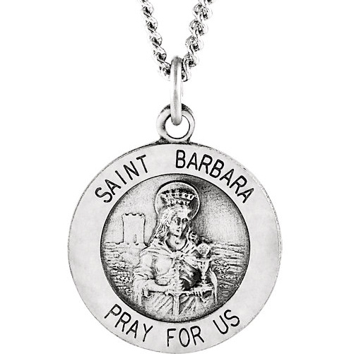 This small round St Barbara medal dangles from a sterling silver 18-inch matching chain. Dimensions: 15mm diameter. Medal inscription: SAINT BARBARA PRAY FOR US. Weighs .90 DWT (1.39 grams). Please note: weight is approximate, actual weight may vary.