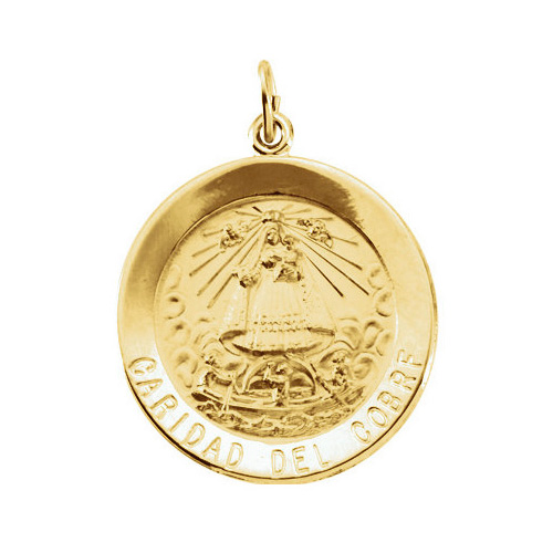 This round Caridad del Cobre medal is made of solid 14k yellow gold. Dimensions: 25mm diameter, the size of a quarter. Medal inscription reads: CARIDAD DEL COBRE. Weighs 5.46 grams. Please note: weight is approximate, actual weight may vary. Made in USA.