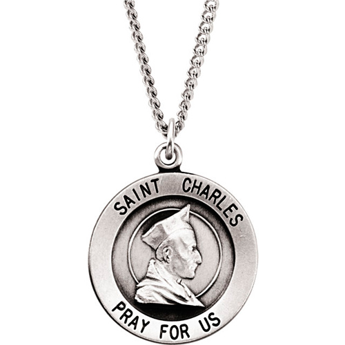 This ladies' solid sterling silver round St Charles medal includes a matching 18 inch chain. Medal inscription: SAINT CHARLES PRAY FOR US. Item diameter: 18.5mm. Weighs 2.30 grams. Please note: weight is approximate, actual weight may vary.
