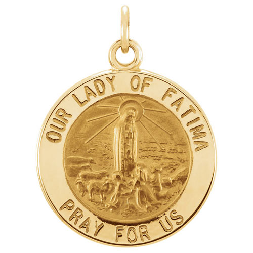 This very small round our lady of Fatima medal is made of solid 14k yellow gold. Inscription reads: OUR LADY OF FATIMA PRAY FOR US. Dimensions: 12mm. This petite medal is half the size of a quarter and weighs 0.78 grams. Please note: weight is approximate, actual weight may vary. Jump ring dimensions: 1.4mm x 2.0mm. We recommend a chain no wider than 1.0mm. Made in USA.
