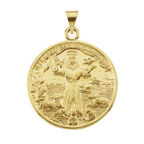 Round Saint Francis medal is highly detailed and made of polished solid 14k yellow gold. Dimensions: 26mm diameter. This item is slightly larger than a quarter. Inscription reads: ST FRANCIS OF ASSISI PROTECTOR OF ANIMALS.Weighs 8.39 grams. Please note: weight is approximate, actual weight may vary. Chain not included.