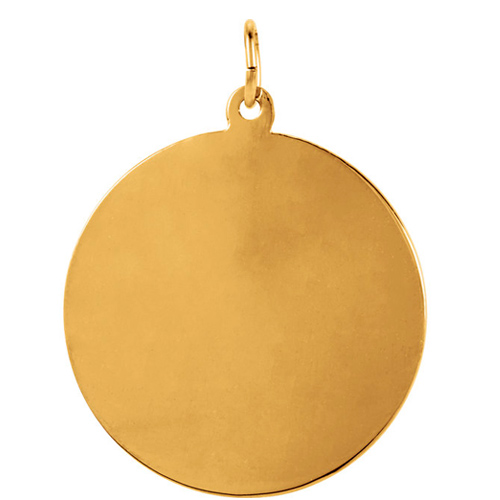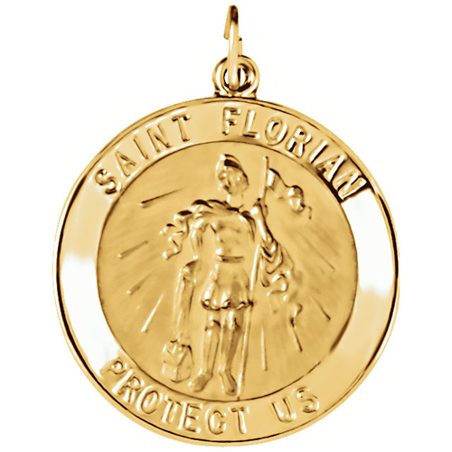 This round St Florian medal is made of polished 14kt yellow gold. Dimensions: 25mm. Inscription: SAINT FLORIAN PROTECT US. This item is the size of a quarter. Weighs 5.32 grams. Available while supplies last.