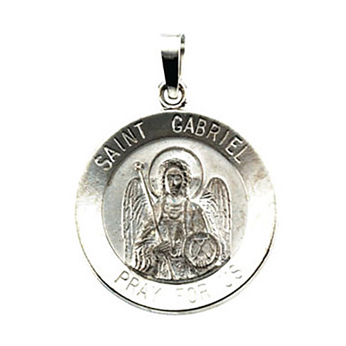 This small round St. Gabriel medal is made of polished 14kt white gold. Inscription: SAINT GABRIEL PROTECT US. Dimensions: 18mm. This item is the size of a dime. Weighs 2.39 grams. Please note: weight is approximate, actual weight may vary. Jump ring dimensions: 2.3mm x 2.75mm. We recommend a chain no wider than 2.0mm. Made in the USA.