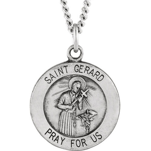Sterling silver 22mm St Gerard medal with 18-inch matching chain. Inscription reads: SAINT GERARD PRAY FOR US. Weighs 12.22 grams. Please note: weight is approximate, actual weight may vary.