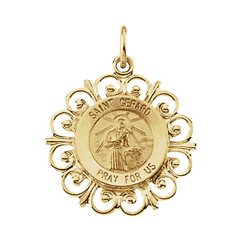 This fancy St Gerard medal is made of polished solid 14k yellow gold. Inscription reads: SAINT GERARD PRAY FOR US. Dimensions: 18.5mm, slightly smaller than a penny. Weighs 1.47 grams. Bail size: 2.25mm x 2.25mm; we recommend a chain no wider than 2mm. Made in USA.