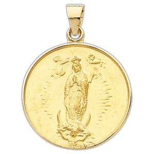 Round Lady of Guadalupe medal is made of polished 18kt yellow gold. Dimensions: 24.5mm. Weighs 6.28 grams. Please note: weight is approximate, actual weight may vary. Chain not included.