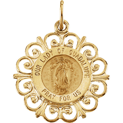 Lady of Guadalupe medal features scalloped edges and is made of polished 14kt yellow gold. Dimensions: 20x18mm. This item is the size of a penny. Inscription: OUR LADY OF GUADALUPE PRAY FOR US. Weighs 1.46 grams. Please note: weight is approximate, actual weight may vary. Chain not included.