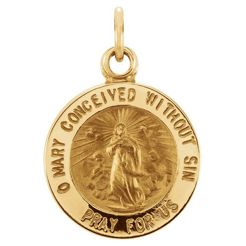 This very small Immaculate conception medal is made of polished 14kt yellow gold. Inscription reads: O MARY CONCEIVED WITHOUT SIN PRAY FOR US. This item is half the size of a quarter and weighs 0.90 grams. Please note: weight is approximate, actual weight may vary. Chain not included.