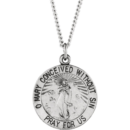 Polished sterling silver immaculate conception medal includes matching 18-inch chain. Inscription reads: MARY CONCEIVED WITHOUT SIN PRAY FOR US. This item is the size of a penny, and weighs 2.20 grams. Please note: weight is approximate, actual weight may vary.