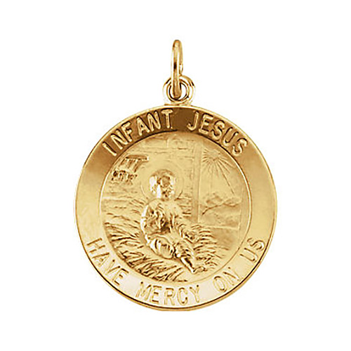 This infant Jesus medal is made of polished solid 14k yellow gold. Item diameter: 18mm, the size of a dime. Inscription reads: INFANT JESUS HAVE MERCY ON US. Weighs 1.45 DWT (2.25 grams). Please note: weight is approximate, actual weight may vary. Chain not included.