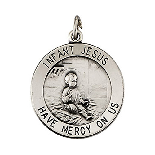 Sterling silver round Infant Jesus medal includes a matching 18-inch chain. Inscription reads: INFANT JESUS HAVE MERCY ON US. Weighs 2.23 grams. Please note: weight is approximate, actual weight may vary.