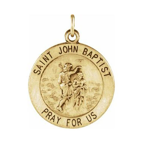 Polished 14kt yellow gold medal. Inscription reads: SAINT JOHN BAPTIST PRAY FOR US. Weighs 0.82 DWT (1.28 grams). Please note: weight is approximate, actual weight may vary. Chain not included.