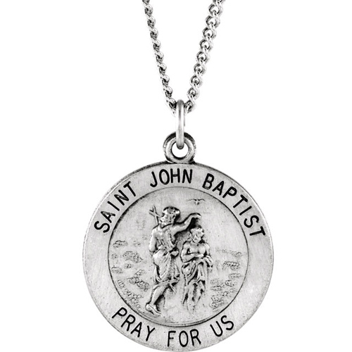 This ladies' sterling silver St John the Baptist medal includes a matching 18-inch chain. Item size: 18.5mm. This item is the size of a penny. Inscription reads: SAINT JOHN BAPTIST PRAY FOR US. Weighs 2.22 grams. Made in the USA.