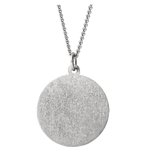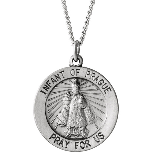 This round Infant of Prague medal is made of antiqued sterling silver medal and includes an 18-inch chain. Item size: 18.5mm. Inscription reads: INFANT OF PRAGUE PRAY FOR US. Weighs 2.19 grams.