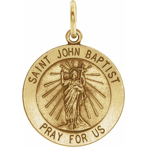 This tiny round St John the Baptist medal is made of 14kt yellow gold. Diameter: 12mm. This item is half the height of a quarter. Inscription reads: SAINT JOHN BAPTIST PRAY FOR US. Weighs 0.81 grams. Made in the USA.