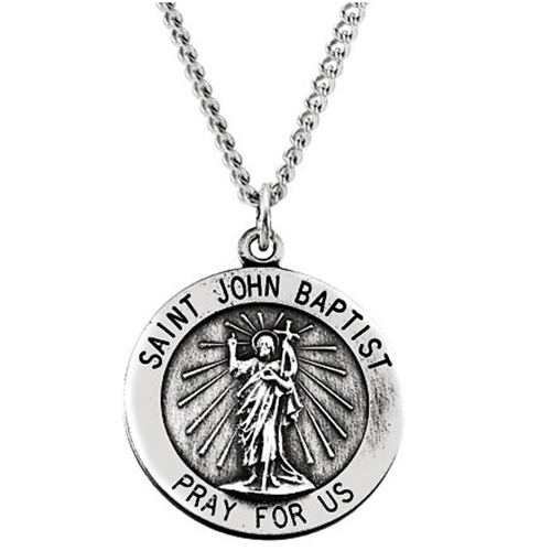 This round St John the Baptist medal is made of antiqued sterling silver and comes with a sterling silver 18-inch chain. Inscription reads: SAINT JOHN BAPTIST PRAY FOR US. Weighs 2.29 grams. Please note: weight is approximate, actual weight may vary.